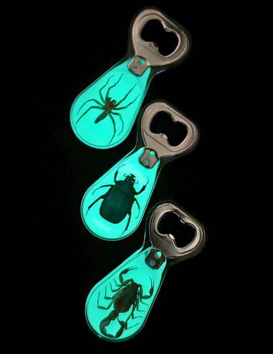 Make your merchandise pop with these Glow-in-the-Dark Resin Bug Bottle Openers! Each opener showcases a real spider, scorpion, or beetle preserved inside luminous resin, creating an eye-catching glow effect under low light. Perfect for customers looking for a unique, edgy, and functional souvenir.